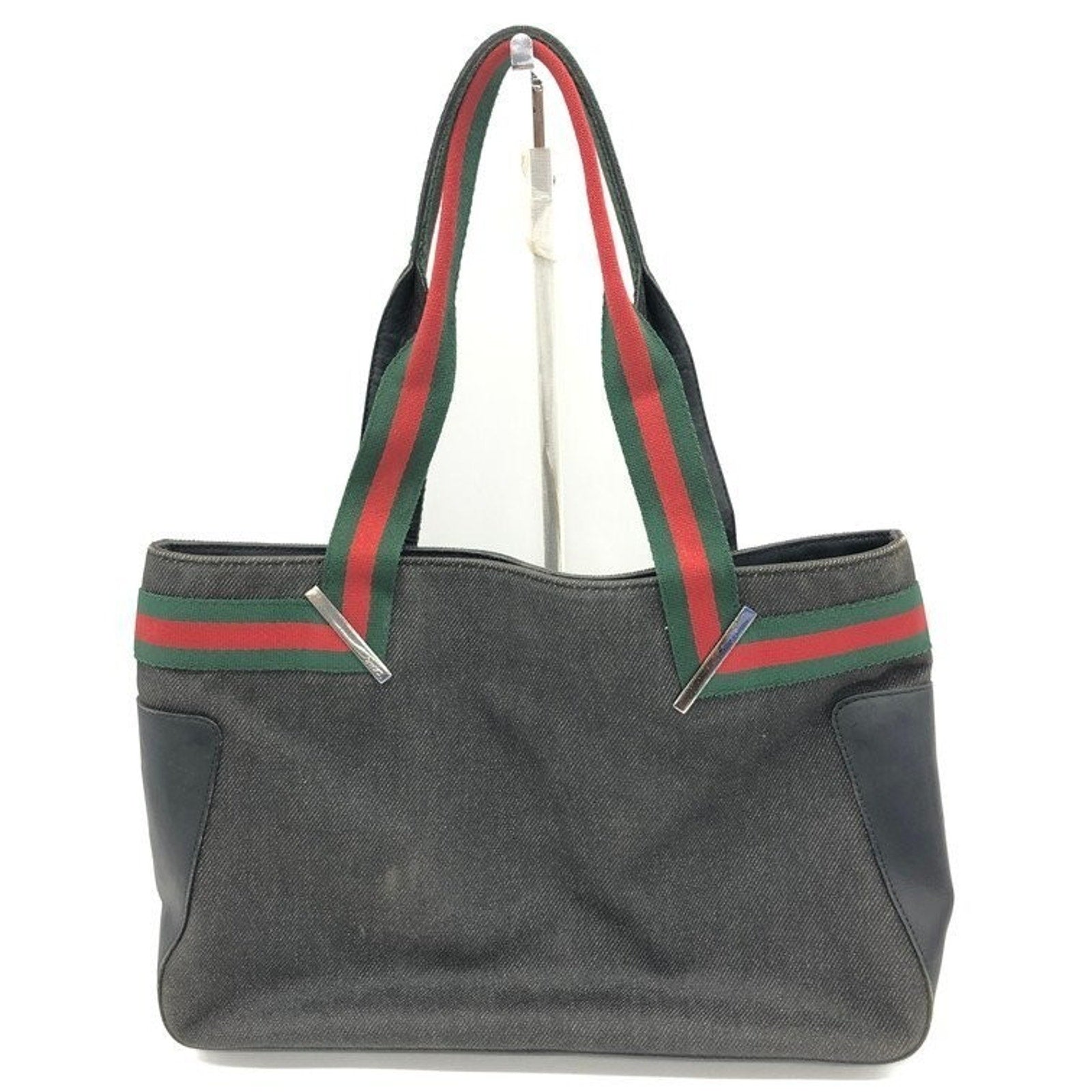 The GUCCI Sherry Line Canvas Tote Bag 23983 002058 is a stylish and versatile handbag designed for women. Made in Italy, this medium-sized rectangular bag features double green handles and silver hardware, adding a touch of luxury to the overall design. The vintage Gucci Sherry model is crafted from black canvas, making it a classic choice for everyday use or special occasions. Perfect for those who appreciate the quality craftsmanship and timeless elegance that Gucci is known for.