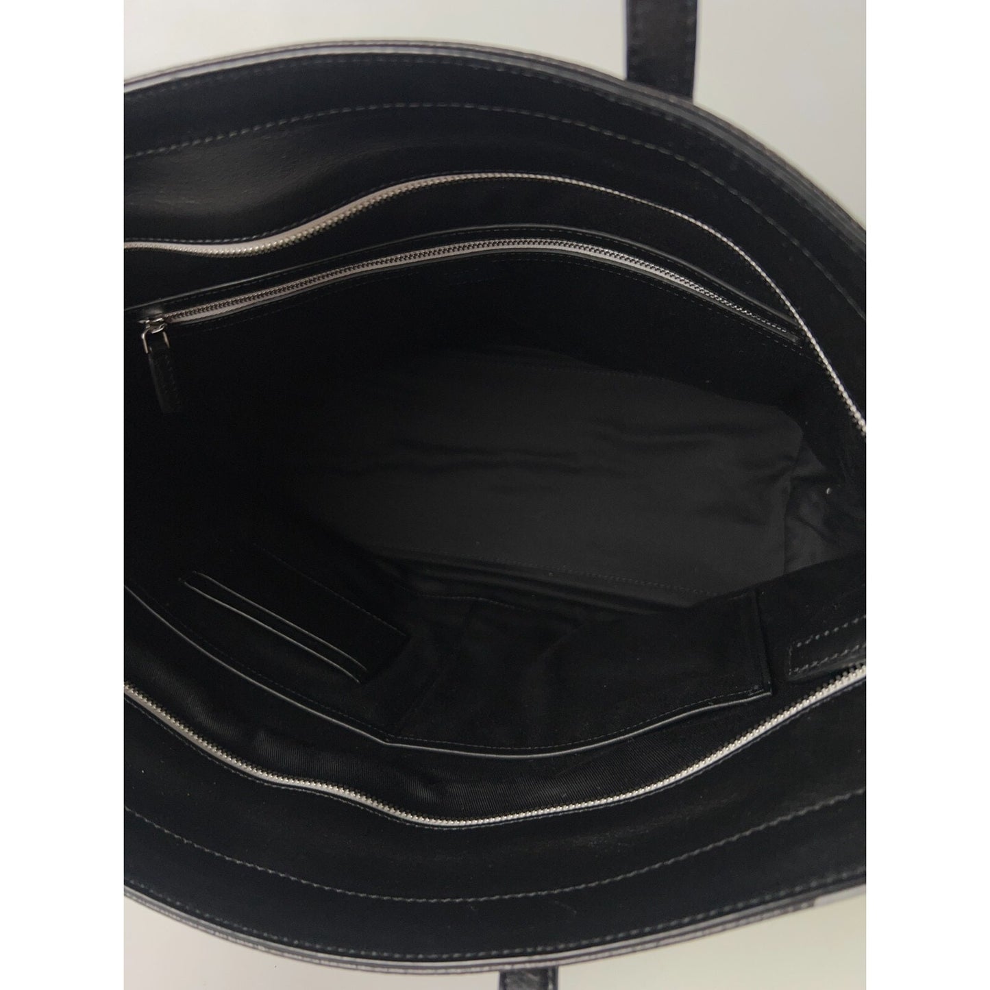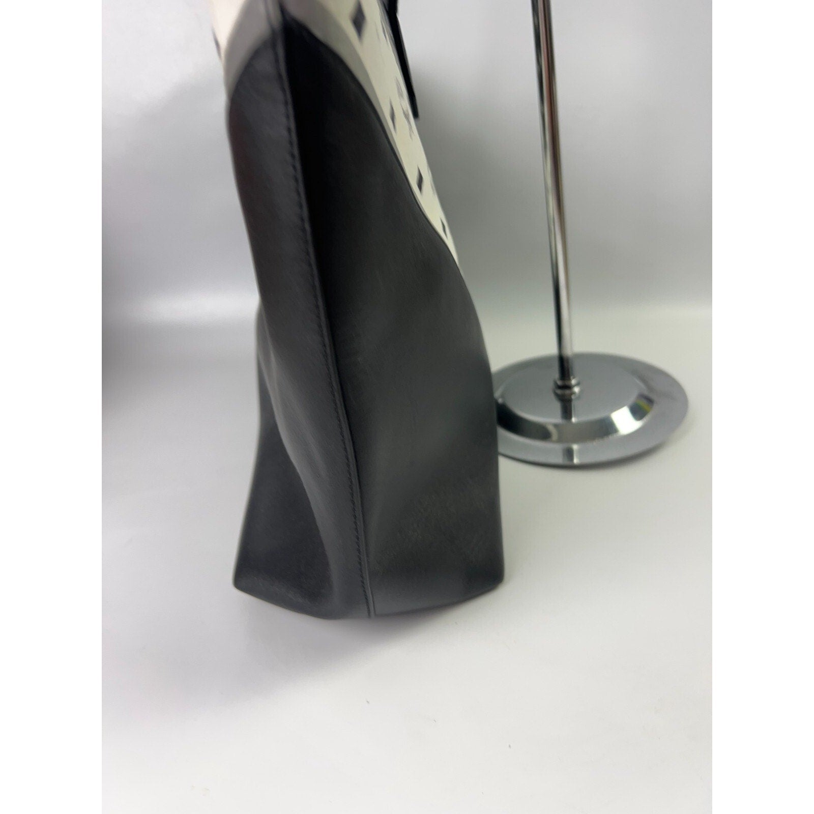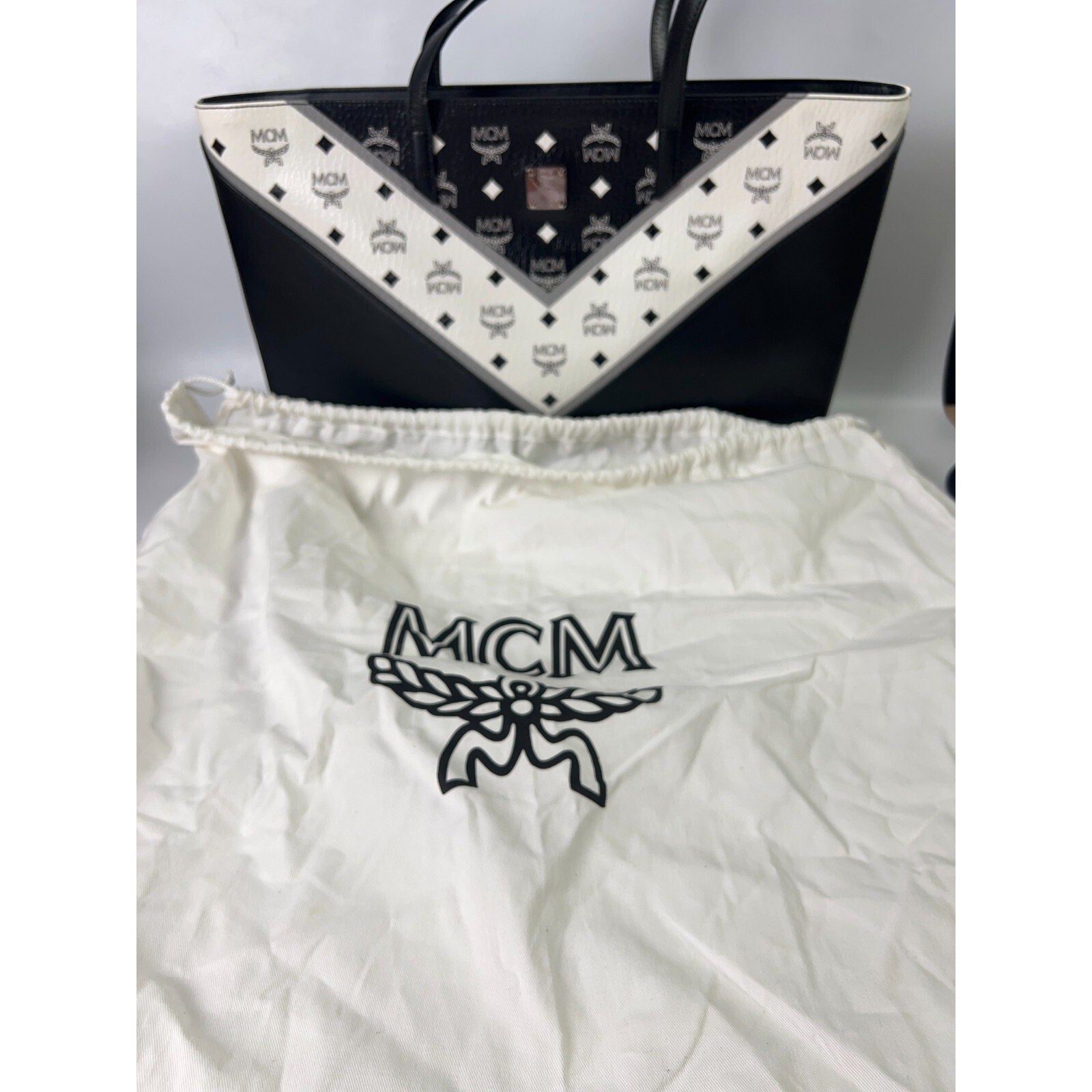 The MCM Leather Visetos large tote shopper bag in black and white features a signature logo pattern on the exterior, making it a stylish and modern accessory for any occasion. This rectangular-shaped bag is designed with double black handles and silver and black hardware accents, adding a touch of luxury to the design. The interior is lined with black and white leather, providing a sleek and sophisticated look. Perfect for travel, casual outings, or business meetings, this designer tote from MCM exudes a sense of prestige and elegance. The bag comes with a dust bag, making it a practical and stylish choice for the fashion-forward woman.